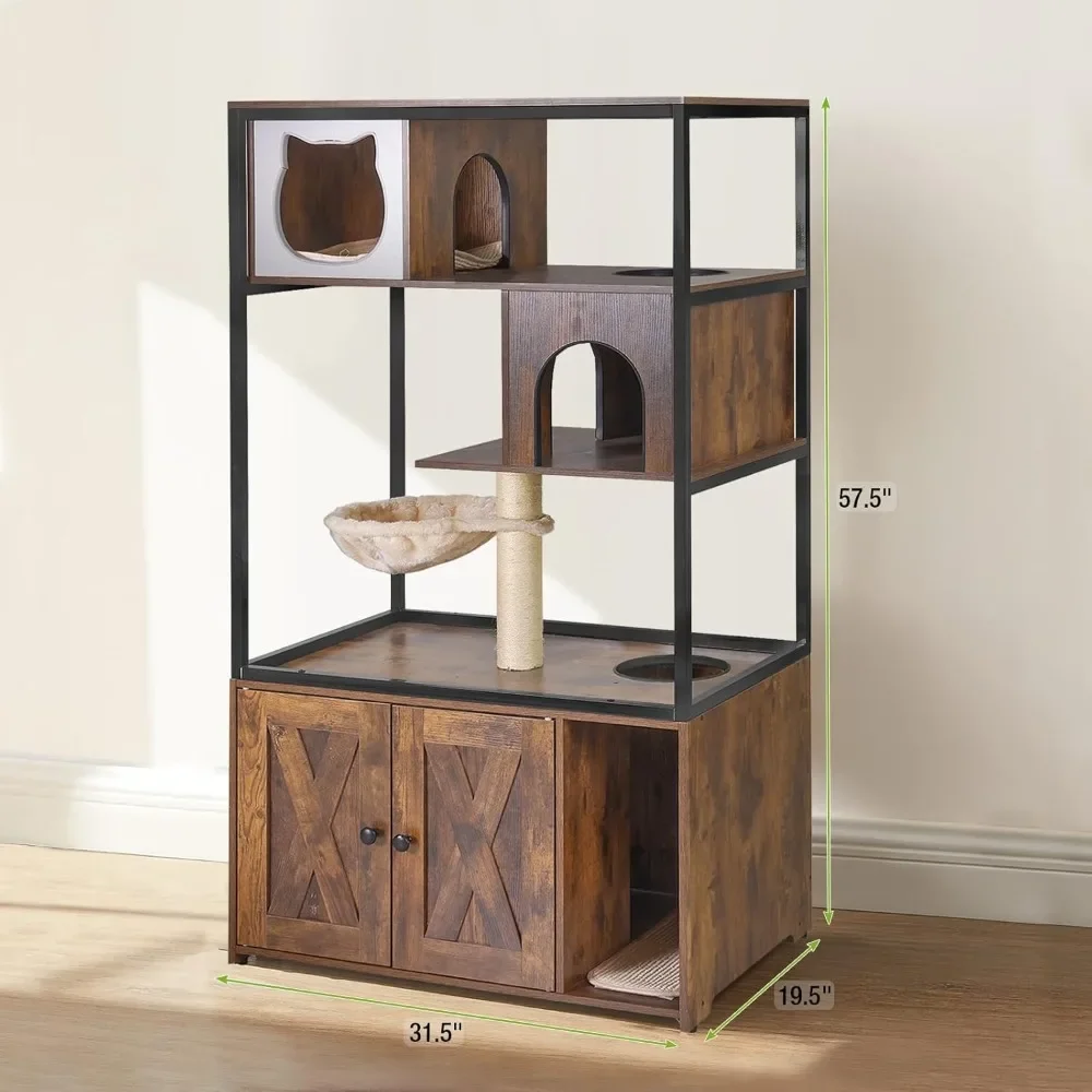 - 4-Story Cat House: coming with a cat cave, a scratching post, a hammock, and a cat litter box enclosure-now, your cat can observe, relax, play, eat, and answer nature's call. All in one place