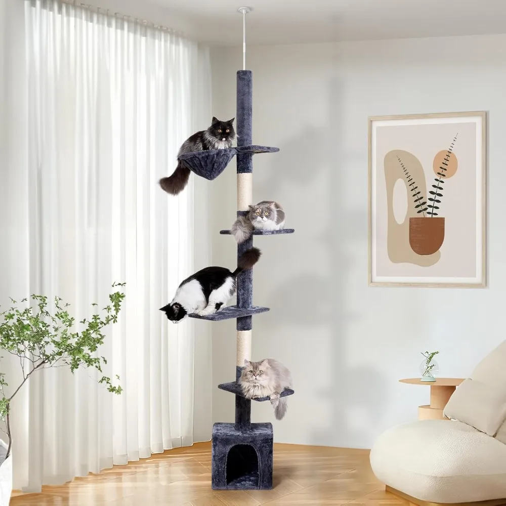 - Product Introduction: This is a floor to ceiling cat tree, Comes with a height-adjustable cat climber frame,ranging from 86 inches to 109 inches (suitable for 1~2 cats weighing no more than 20 pounds).The entire cat tree consists of 8 layers of blankets and 5 platforms and the size of the column and the strength of the top spring are increased to make the product more durable.